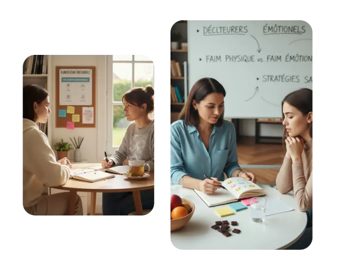Ensemble, nous vous aidons à reprendre confiance en votre corps, à retrouver le plaisir de manger sans culpabilité et à vous libérer du cycle des restrictions et des excès.